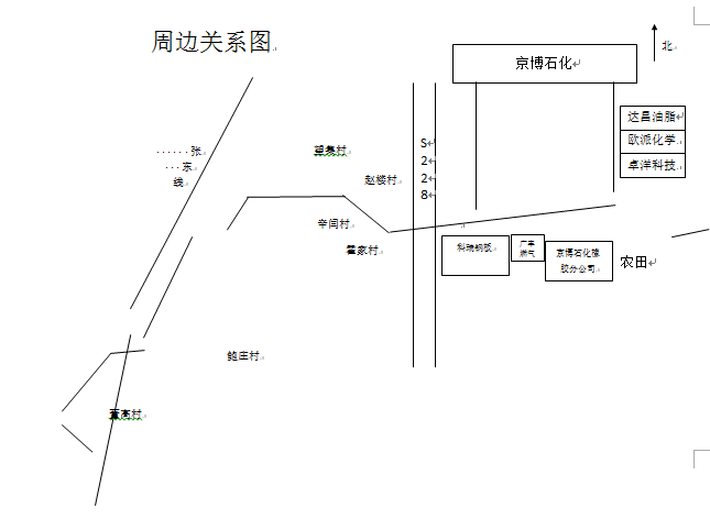 廠區西側為博小鐵路線,西側為盛和熱電有限公司和阿克蘇諾貝爾(博興)有限公司,再向西為勝利三路,自廠區西側出入口設一條道路與經濟開發區化工路相通,化工路向南通向205國道,兩路交叉口西南方向為博興縣汽車站和協和醫院;廠區北側自西向東為凱和化工有限公司、董初村、董孫村,東側為空地,向東為淄東鐵路線,空地東北方向為董孫村部分民居、再向東為博興五中,空地東南方向為西上疃村;廠區向南依次為淄東鐵路線、引黃濟青干渠、205國道、東谷王村。 |