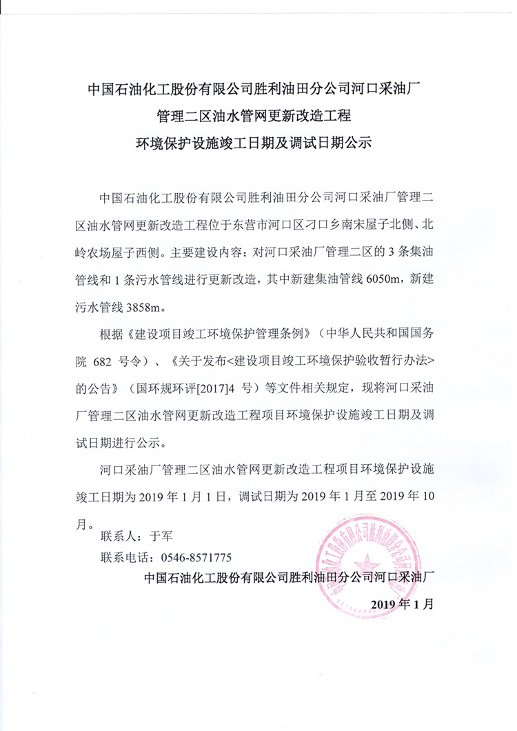 中國石油化工股份有限公司勝利油田分公司河口采油廠管理二區(qū)油水管網(wǎng)更新改造工程環(huán)境保護(hù)設(shè)施竣工日期及調(diào)試日期公示